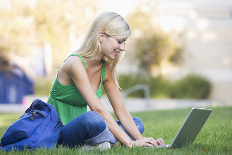 University student using laptop outside Published August 18, 2017 at 800 × 534 in Going Back to College? What’s Truly Essential for Your Dorm Female university student using laptop outside