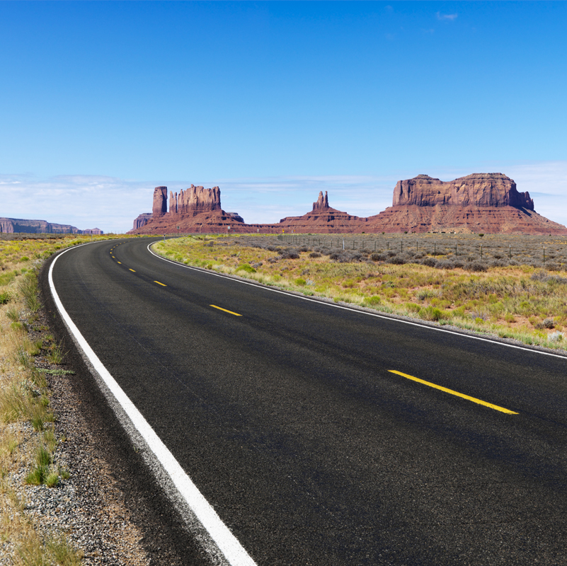 Rural desert highway. Published May 9, 2018 at 801 × 800 in 4 Tips for a Budget-Friendly Plan B Getaway Curve in road in scenic desert road with mesa land formations and mountains.
