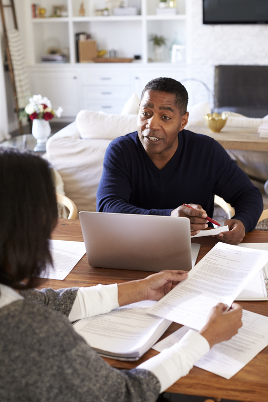 Millennial man with laptop computer giving financial advice to a woman sitting at the table holding a document in her dining room, elevated view, vertical