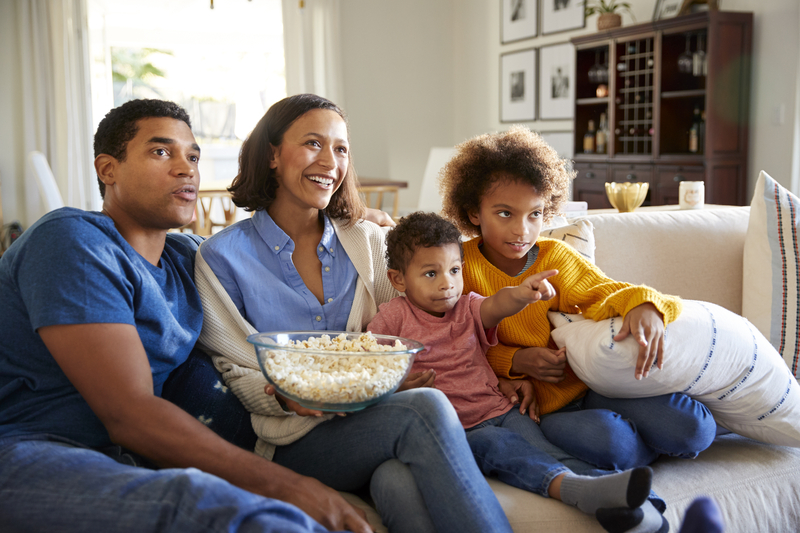 Young family sitting together on the sofa in their living room watching TV and eating popcorn Published June 29, 2020 at 800 × 533 in 3 Ways to Stop Overspending During These Times Young family sitting together on the sofa in their living room watching TV and eating popcorn