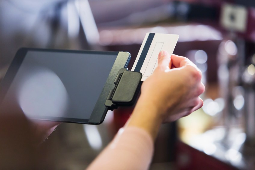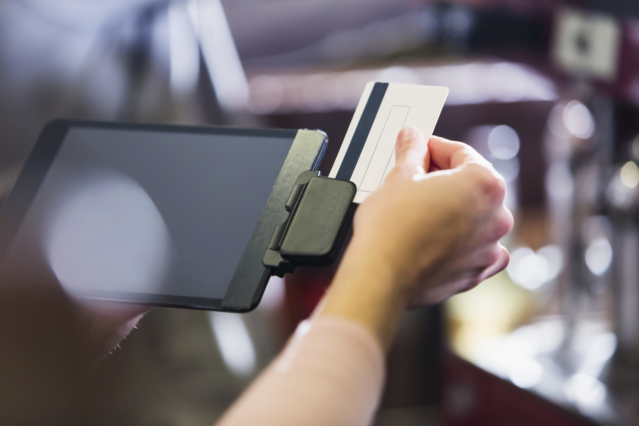 Hand of woman sliding credit card through reader Published July 13, 2022 at 2121 × 1414 in What You Need to Know About Gift Card Scams Close up of a female hand swiping a credit card or gift card through a reader attached to a digital tablet.