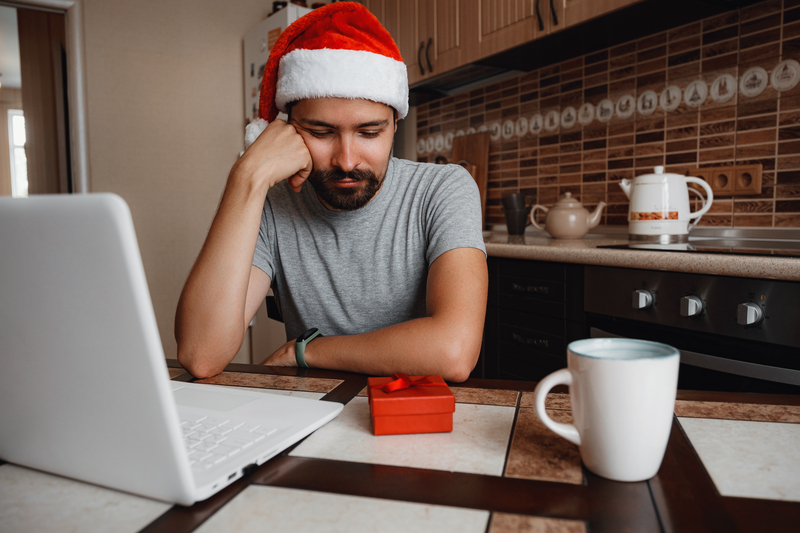 A hipster man with a red cup sitting at home at Christmas time. Published November 22, 2022 at 800 × 533 in How to Keep Holiday Shopping from Draining Your Finances Man felling depressed and lonely during the christmas time. Virtual Christmas house party. Online team meeting video conference calling from home. Man wearing Santa hat.