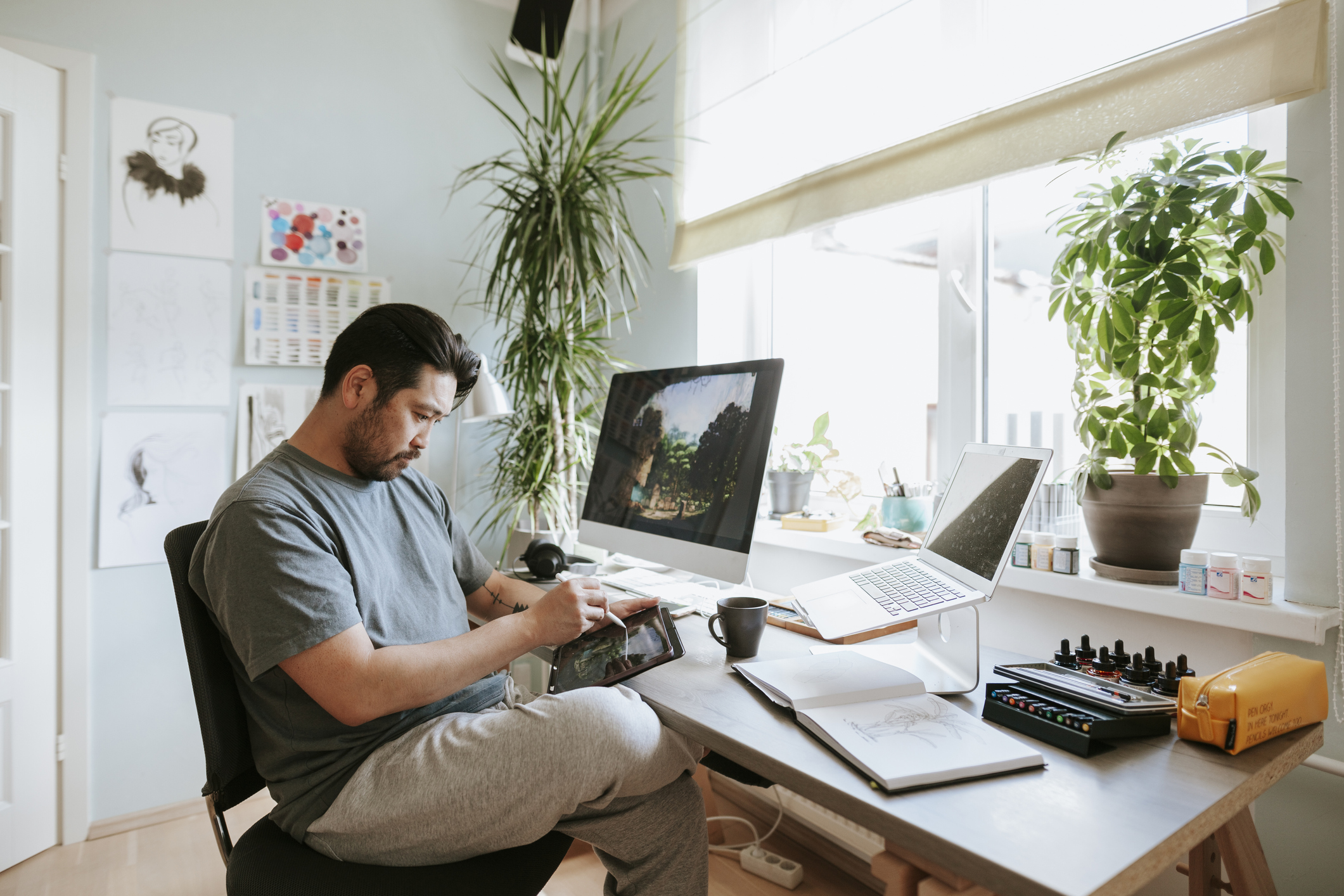 Digital artist drawing on digital table in his home studio Published December 19, 2022 at 2121 × 1414 in Financial Advice for Freelancers Photo series of Japanese digital artist at his home studio working and taking a break.