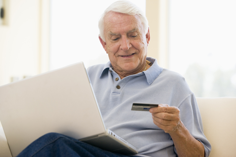 Man in living room with laptop and credit card smiling Published November 4, 2024 at 800 × 534 in Retiring Debt When You Retire