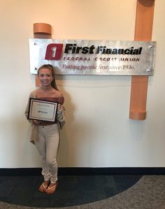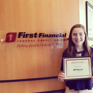 Sabins submitted an essay in which she explained that “good credit is taking responsibility for your spending behaviors and only purchasing items that you can afford.” She recommended choosing a credit union, such as First Financial, because it is “a great place to open a savings account” since “member-owned credit unions charge their members lower monthly fees and lower interest on loans as opposed to banks, as well as they support community programs.”
